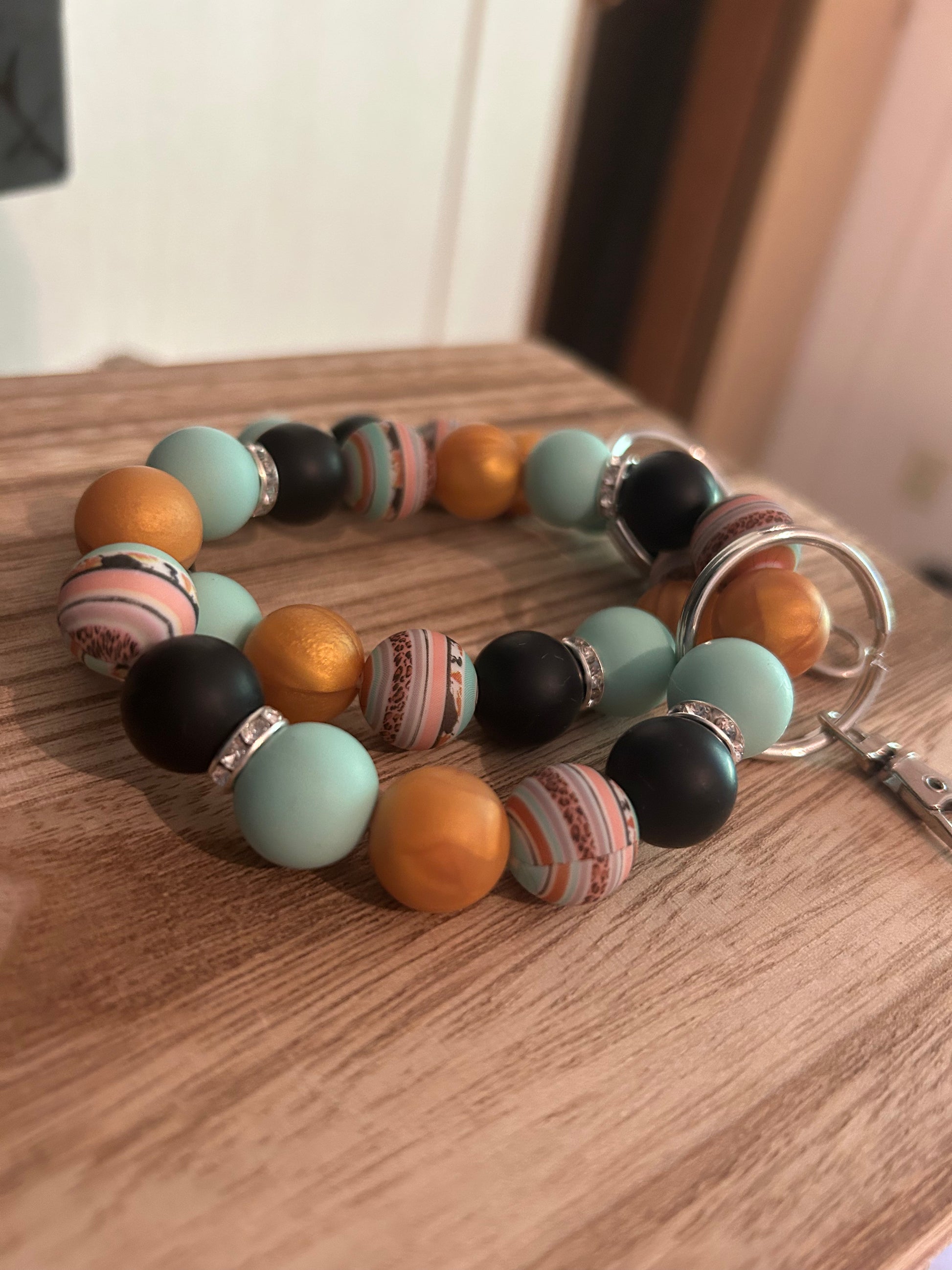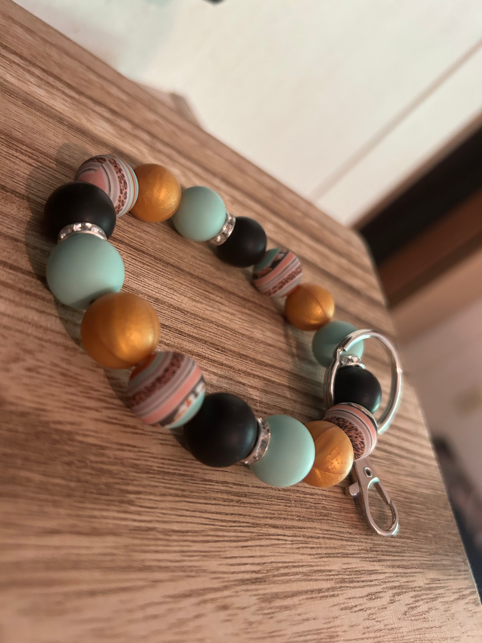 Shimmery gold beads with black and mint beads and a beautiful striped accent beads. Stretchy material makes this perfect for anyone.